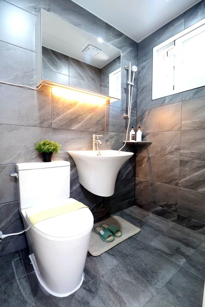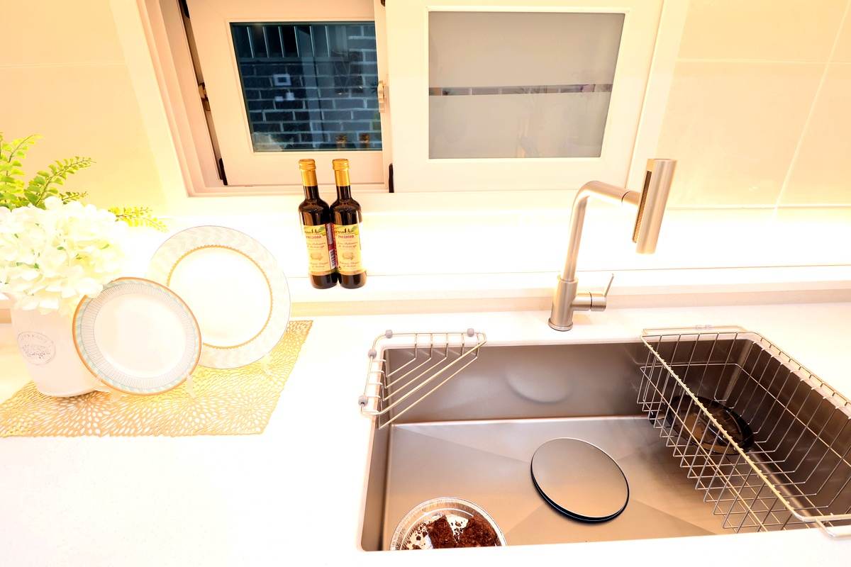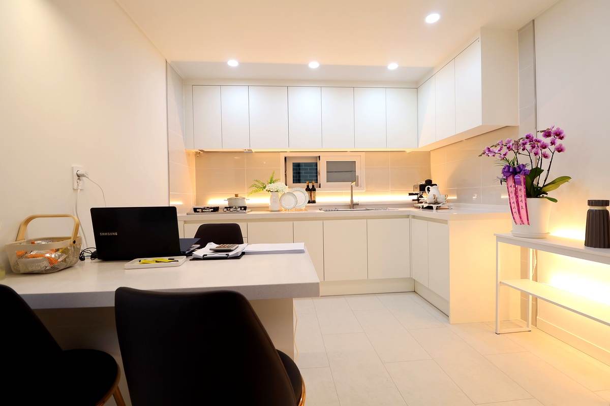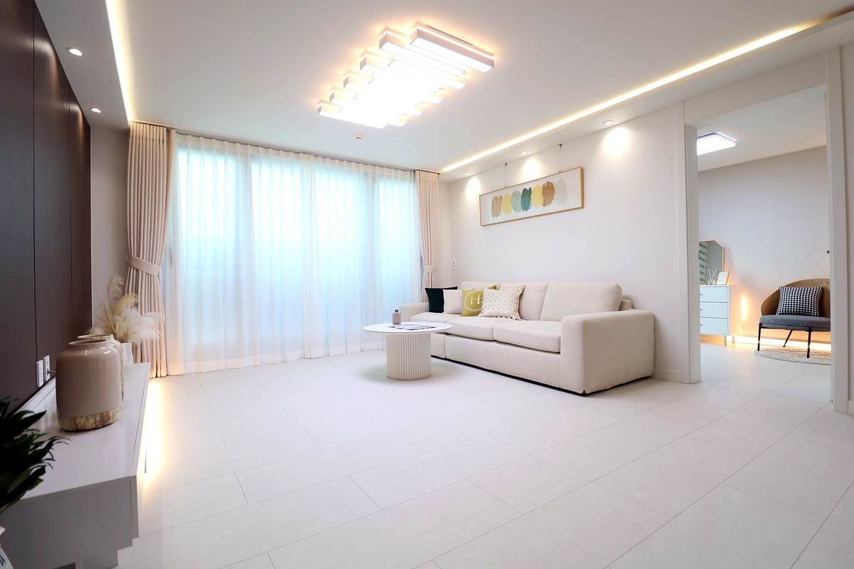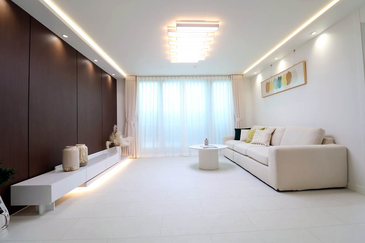 거실은 5~6인용 대형 소파를 놓아도 충분할 만큼 넉넉한 광폭 사이즈를 자랑합니다. 천장에는 매립등과 LED 조명을 시공하여 눈의 피로를 줄이고 전기세 절감 효과까지 챙겼습니다. 주방은 주부들이 가장 선호하는 ‘ㄱ’자형 구조로 설계되어 조리 동선을 최소화했습니다. 특히 주방 창문이 별도로 설치되어 있어 요리 후 환기나 냄새 제거에 탁월한 성능을 발휘합니다.