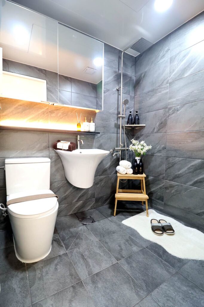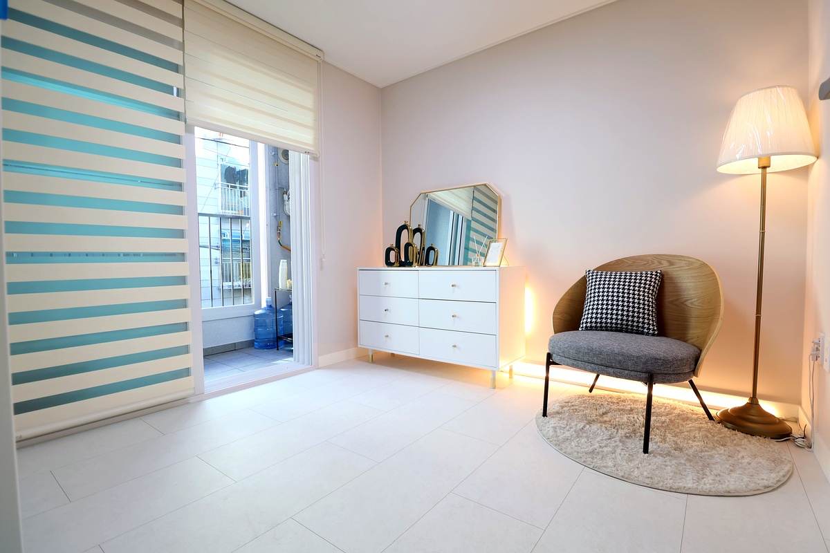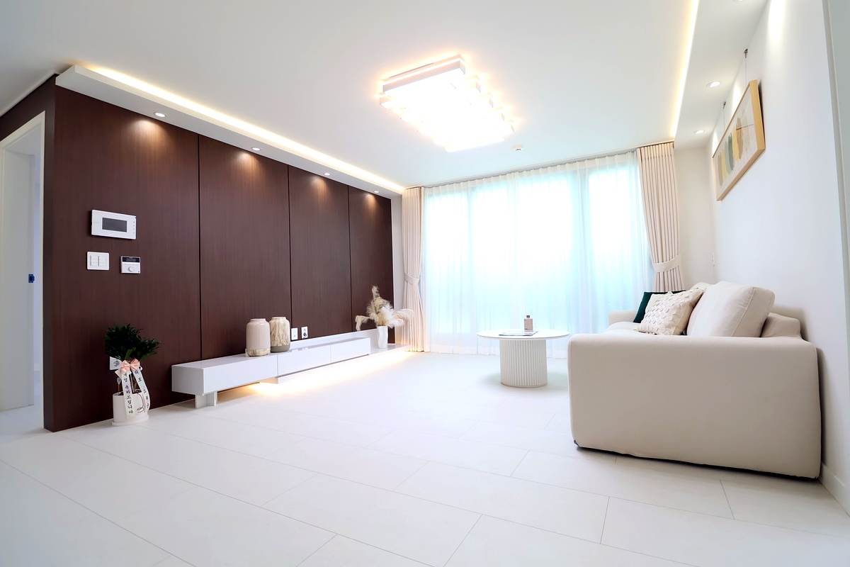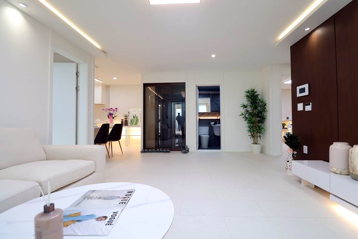 부천역신축빌라 이제 집 안으로 들어가 볼까요? 전체적인 인테리어는 화이트 톤을 베이스로 하여 우드 톤의 아트월로 포인트를 주어, 깔끔하면서도 따뜻한 느낌을 연출했습니다. 유행을 타지 않는 모던한 디자인이라 어떤 가구를 배치해도 조화롭게 어우러집니다.