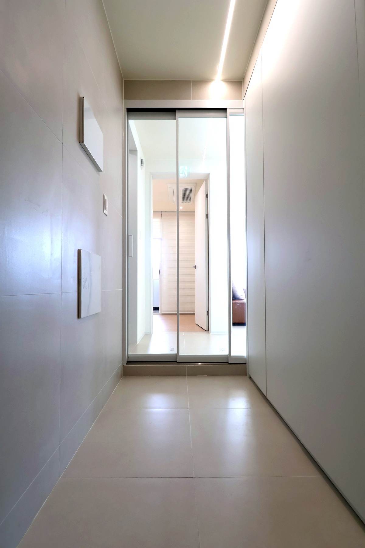현관 전실 공간은 화이트톤 3연동 중문으로 마감되어 있고,