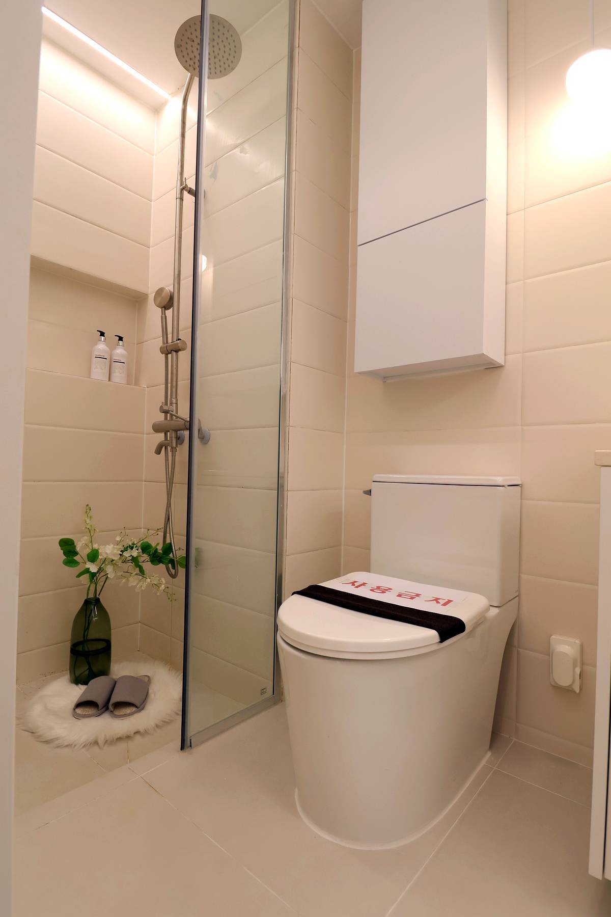 샤워 부스에는 유리 파티션이 시공되어 있습니다.