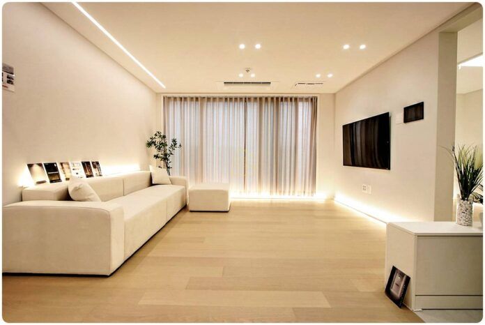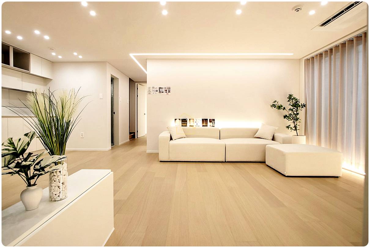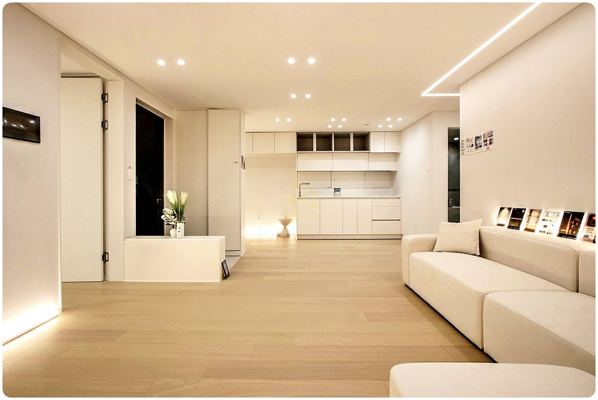 전체적으로 화이트 톤의 세련된 인테리어에 전구색 매립 조명을 사용하여 집안 전체가 은은하고 따뜻한 감성이 느껴지더라고요.