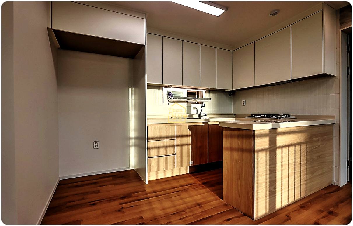 주방은 ㄷ자 또는 1자형 구조로 아일랜드 식탁이 일체형으로 구성되어 있다. 싱크대 벽면에는 환기창이 마련되어 있으며, 냉장고를 위한 공간도 갖춰져 있다. 방마다 발코니, 파우더룸, 안방욕실 등 세부 옵션이 다양해 실용성이 높다.