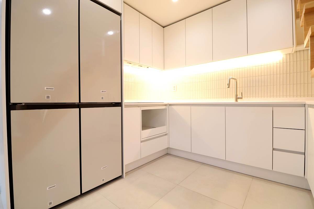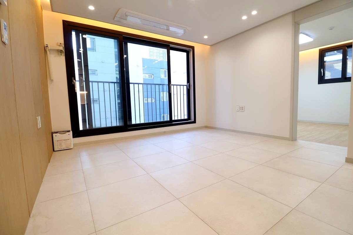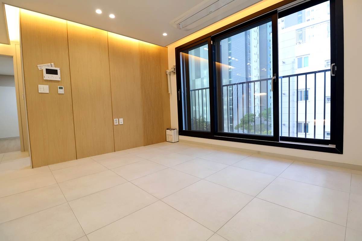 - 거실 및 주방: 반듯한 사각형 구조의 거실은 가구 배치가 자유롭고, 천장형 시스템 에어컨이 공간 효율을 높여줘요. 주방은 동선이 편리한 ㄱ자형으로 설계되었으며 냉장고 박스까지 깔끔하게 마련되어 있습니다.