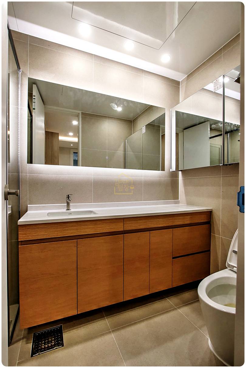 벽면은 타일 아트월과 매립 조명을 적절히 믹스해 고급스러운 카페 같은 분위기를 연출했습니다.