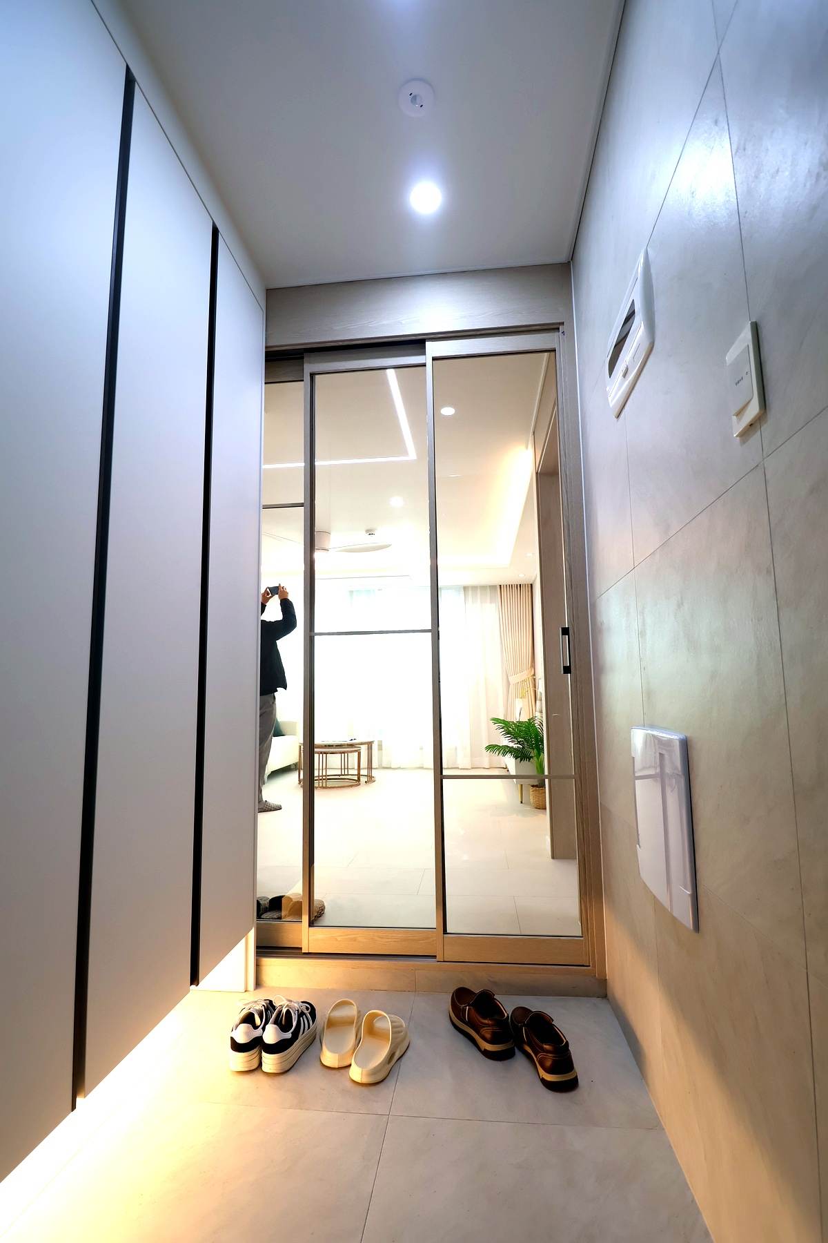 - 현관 전실: 슬라이딩 3도어 중문 + 하단 띄움 시공 신발장으로 먼지 유입 최소화