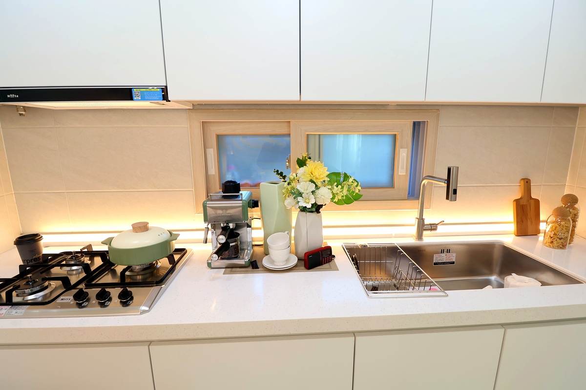 - 주방: 일자형 구조에 상·하부장 풀 구성, 환기용 주방 창 별도 설치