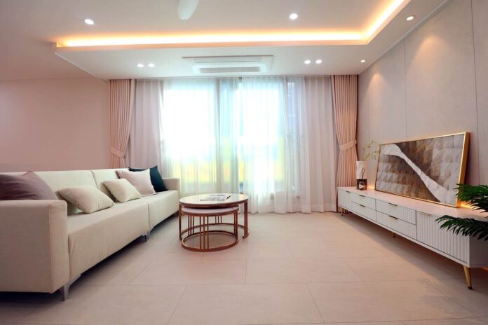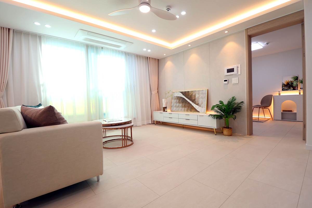 - 거실: 4인 소파 배치 후에도 여유 공간 확보, 광폭 창호로 남향 채광 우수
