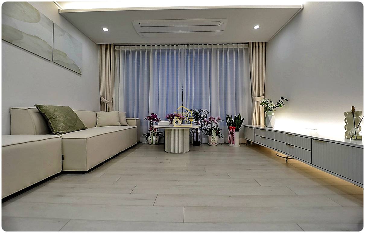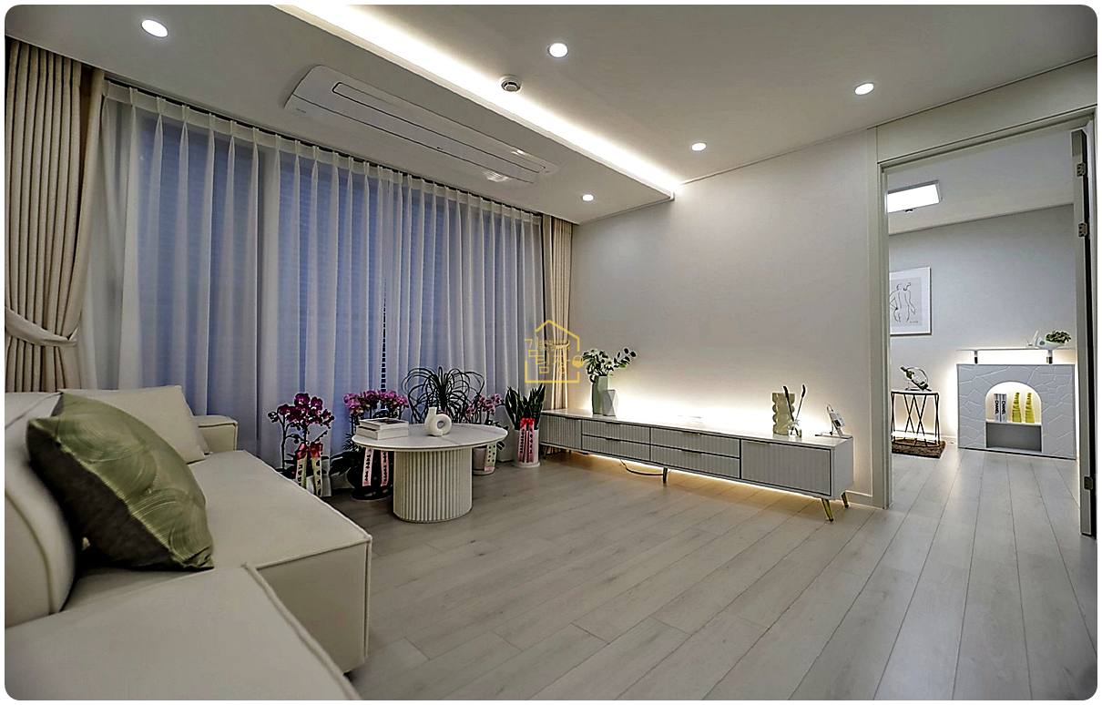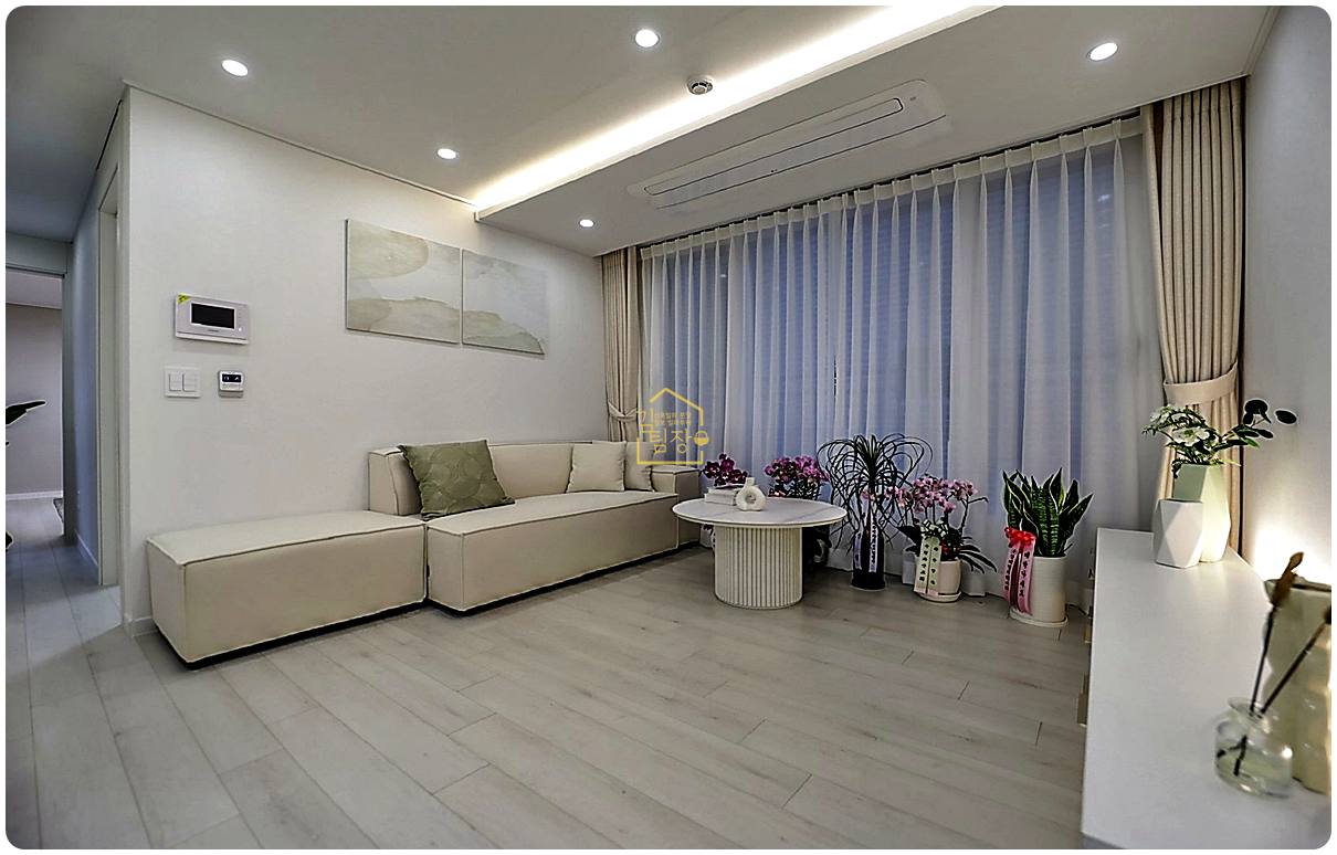 거실은 자연광이 잘 들어와 밝고 따뜻한 분위기를 연출한다. 소파와 거실장 배치에도 여유가 있어 인테리어 활용도가 높다.