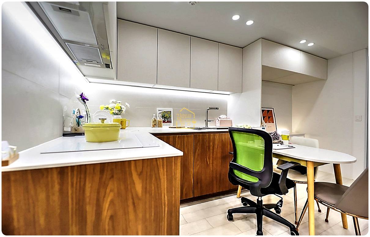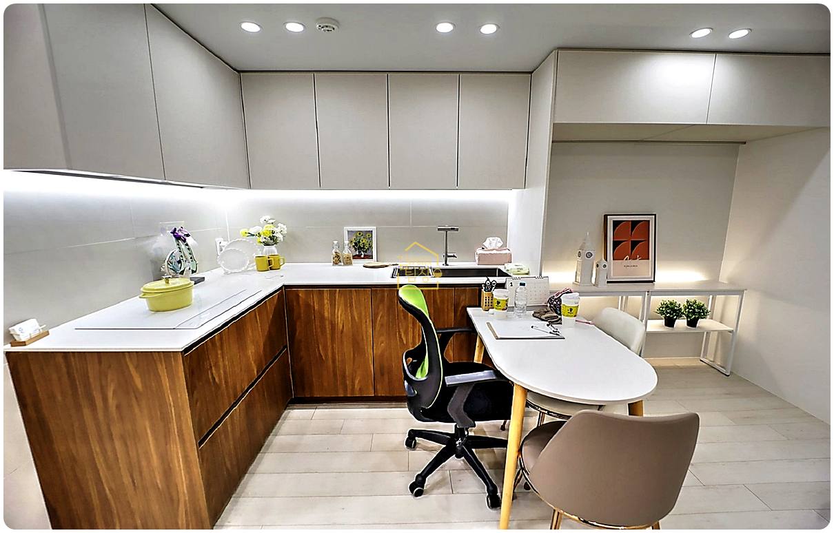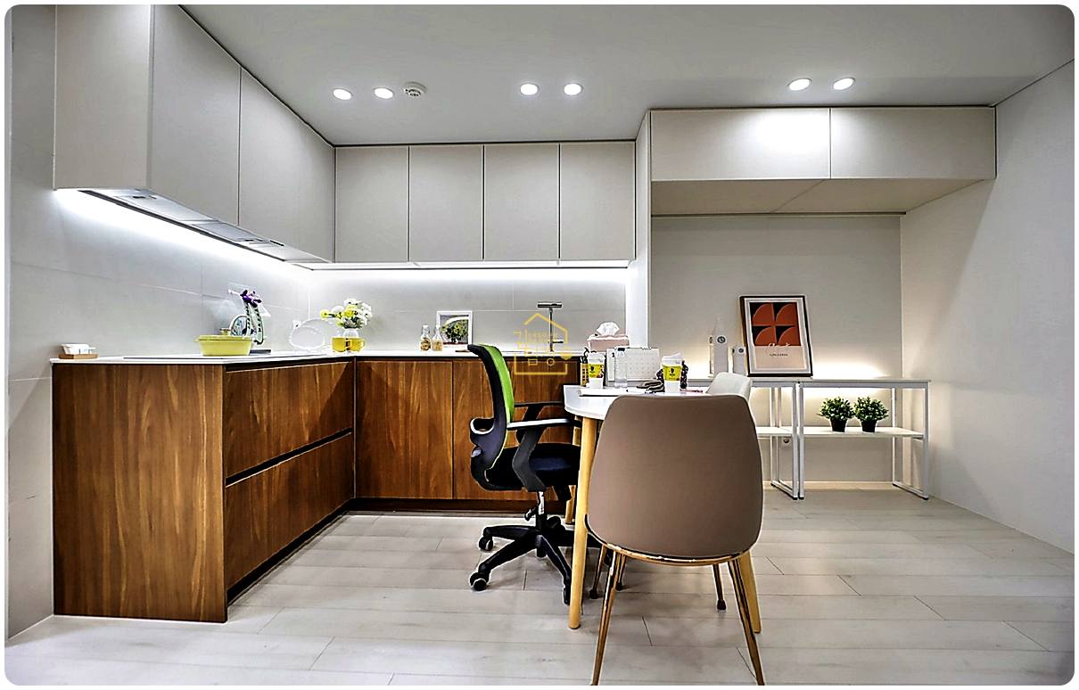 주방은 거실과 분리되어 관리가 쉽고, 상·하부 수납장과 넉넉한 수납 공간이 돋보인다. ㄷ자형 싱크대와 환기창, 4인용 식탁 배치 등 실사용을 고려한 설계가 적용되어 있다.