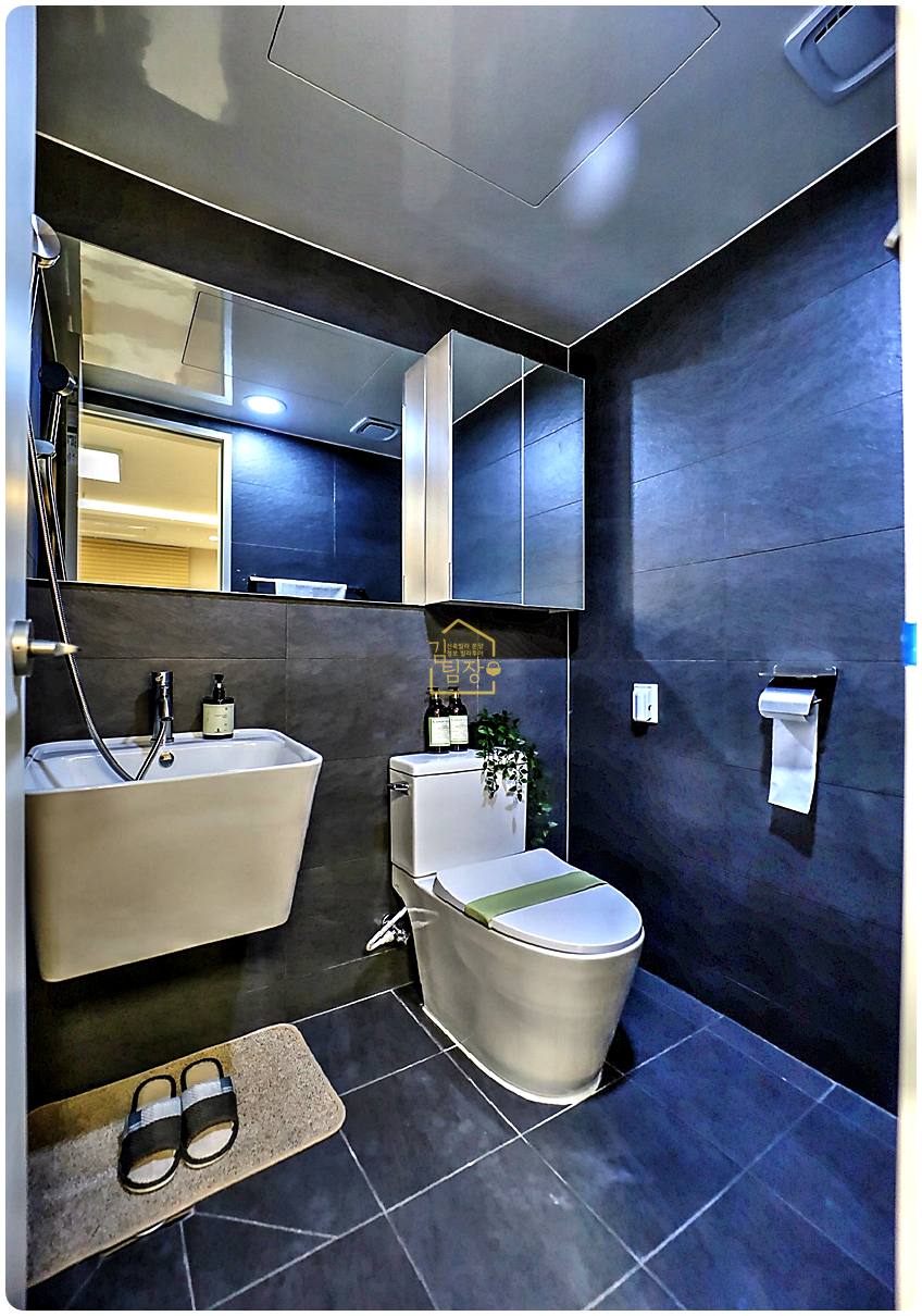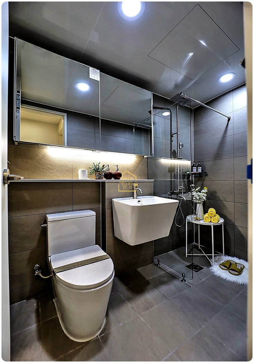 욕실은 깔끔한 마감과 넉넉한 공간으로 관리가 쉽고, 샤워 피티션과 논슬립 타일 등 세심한 설계가 적용되어 있다.