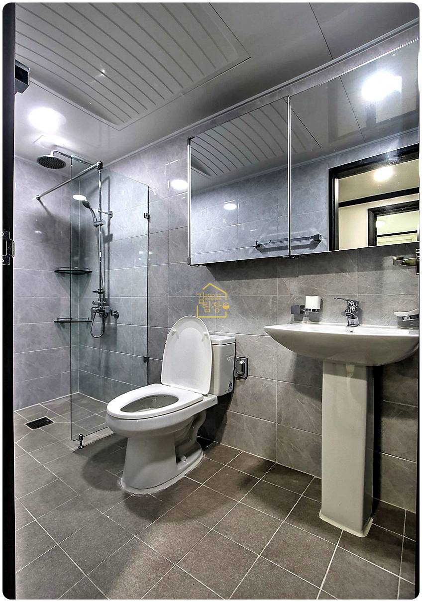 메인 안방에는 보조 욕실이 연결되어 있어 프라이버시와 편의성을 모두 만족시킨다. 두 개의 욕실은 해바라기 수전, 세면대, 수납장, 다용도 선반 등 실용적인 설비로 구성되어 있다.