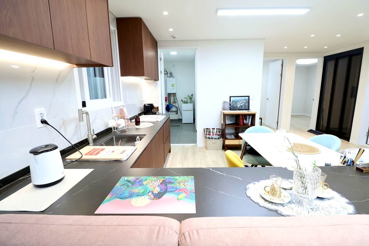 주방은 주부님들이 가장 선호하시는 ㄱ자형 구조로 설계되어 동선이 참 효율적이었어요.