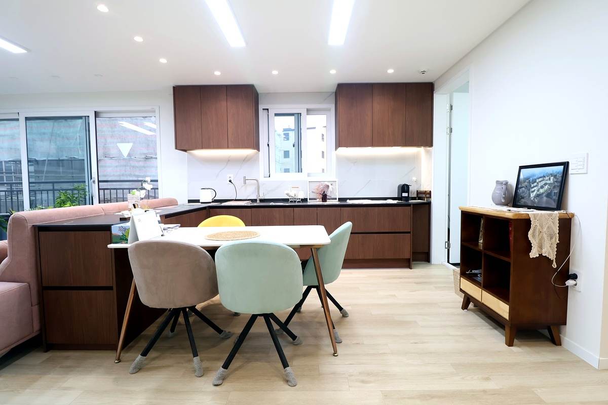 주방은 주부님들이 가장 선호하시는 ㄱ자형 구조로 설계되어 동선이 참 효율적이었어요.