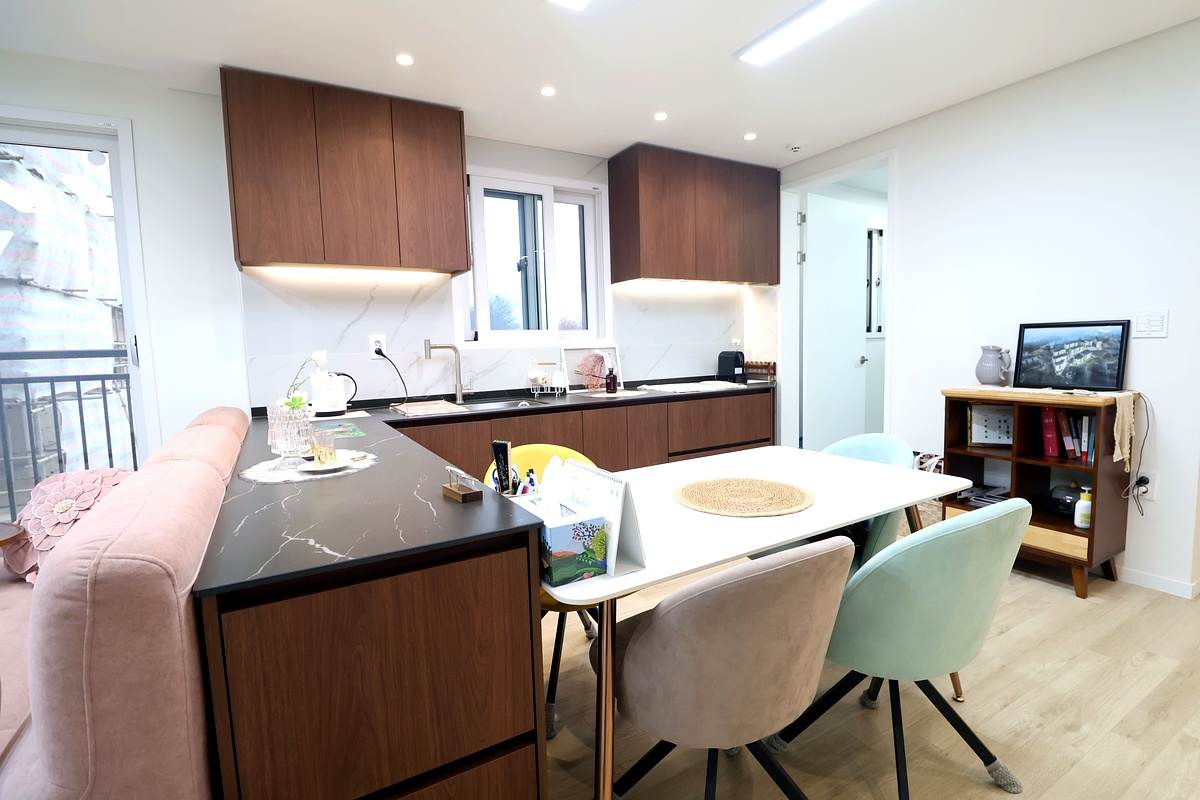 냉장고 자리와 식탁 공간도 짜임새 있게 배치되어 있어서 가구 들이고 살림 시작하면 참 깔끔하겠다는 생각이 절로 들더라고요.
