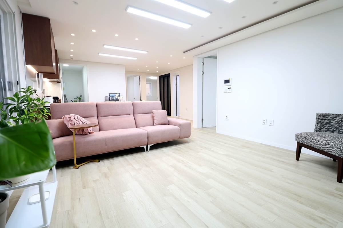 천장에 깔끔하게 매립된 시스템 에어컨 덕분에 여름철에도 거실 공간을 넓고 쾌적하게 활용할 수 있다는 점이 마음에 들었네요.