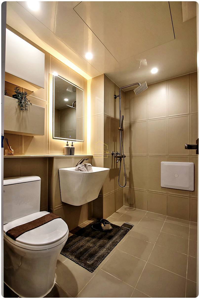욕실은 해바라기 수전, 세면대 수납장, 다용도 선반이