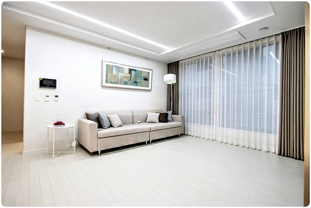 거실은 소파, 거실장, TV장 배치가 여유롭고
